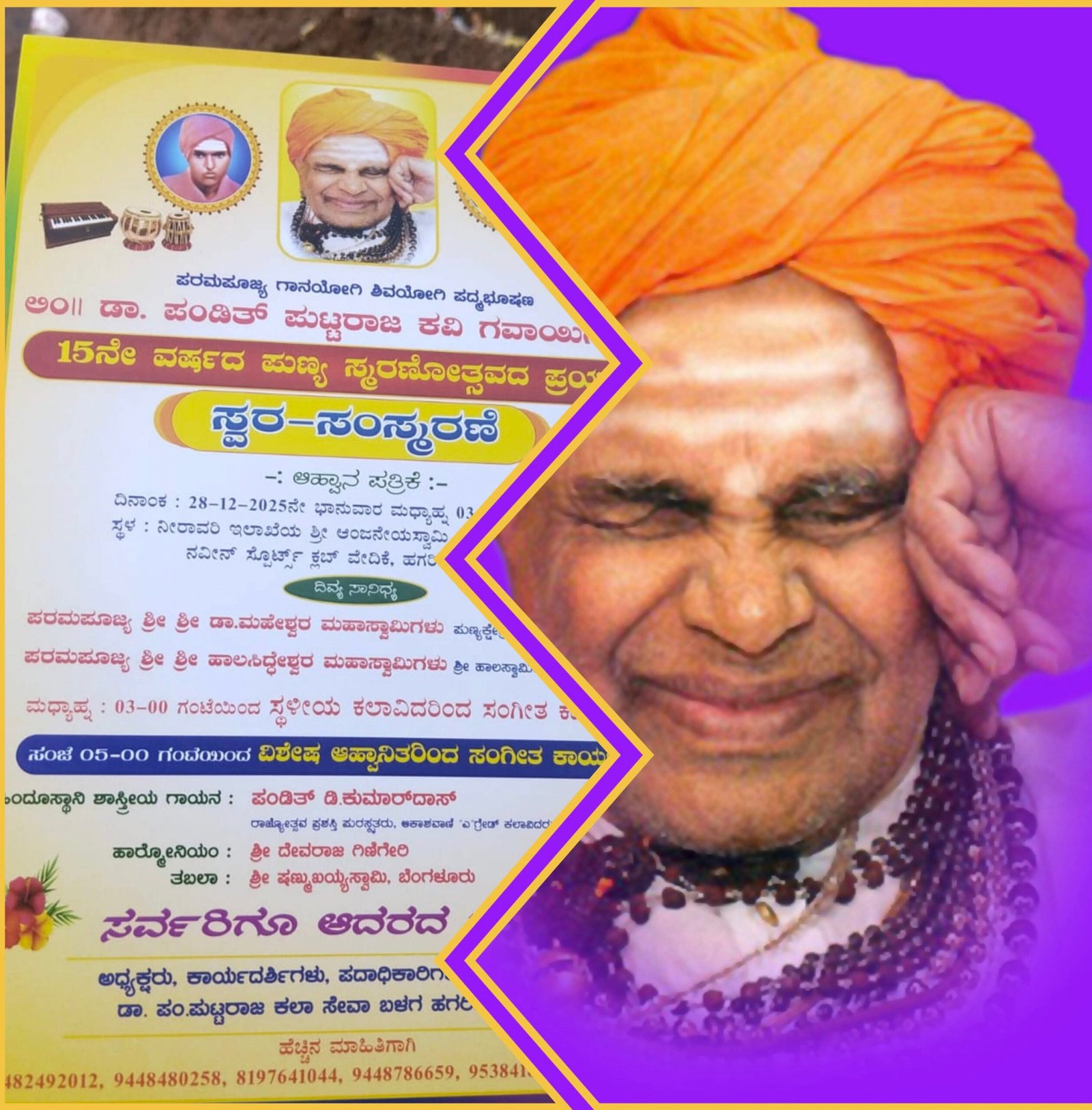 ಗಾನಯೋಗಿ ಪದ್ಮಭೂಷಣ ಲಿಂ.ಡಾ.ಪಂಡಿತ್ ಪುಟ್ಟರಾಜ ಗವಾಯಿಗಳವರ 15 ನೇ ವರ್ಷದ ಪುಣ್ಯ ಸ್ಮರಣೋತ್ಸವದ ನಿಮಿತ್ತ 29 ಡಿಸೆಂಬರ್, ಭಾನುವಾರ “ಸ್ವರ-ಸಂಸ್ಮರಣೆ” ಕಾರ್ಯಕ್ರಮವನ್ನು ಪಟ್ಟಣದ ಡಾ.ಪಂ.ಪುಟ್ಟರಾಜ ಕಲಾ ಸೇವಾ ಬಳಗದವರು ಹಮ್ಮಿಕೊಂಡಿದ್ದಾರೆ.