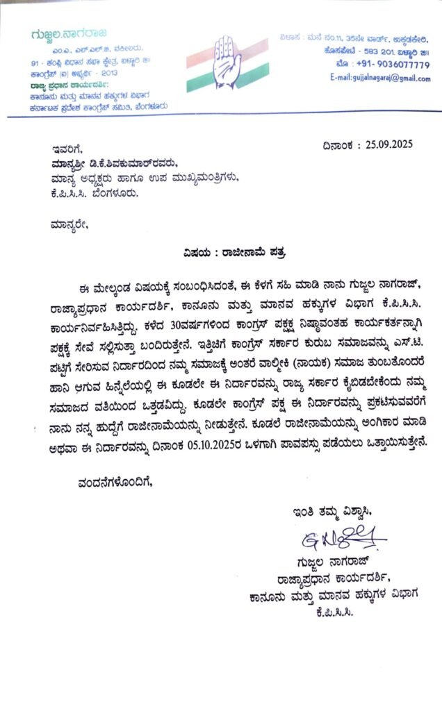 ಕಾಂಗ್ರೆಸ್ ಪಕ್ಷದ ಕಾನೂನು ಮತ್ತು ಮಾನವ ಹಕ್ಕುಗಳ ವಿಭಾಗದ ರಾಜ್ಯ ಪ್ರಧಾನ ಕಾರ್ಯದರ್ಶಿ ಗುಜ್ಜಲ್ ನಾಗರಾಜ್ ತಮ್ಮ ಹುದ್ದೆಗೆ ರಾಜೀನಾಮೆ ನೀಡಿದ್ದಾರೆ.