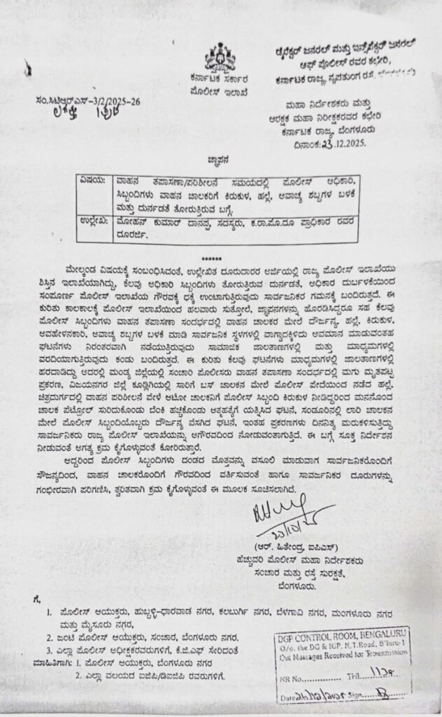 ಬೆಂಗಳೂರು:03, ಪೊಲೀಸ್ ಸಿಬ್ಬಂದಿಗಳು ವಾಹನ ತಪಾಸಣೆ ದಂಡದ ಮೊತ್ತ ವಸೂಲಾತಿ ಮಾಡುವಾಗ ಸಾರ್ವಜನಿಕರೊಂದಿಗೆ ಸೌಜನ್ಯದಿಂದ, ವಾಹನ ಚಾಲಕರೊಂದಿಗೆ ಗೌರವದಿಂದ ವರ್ತಿಸುವಂತೆ ಹಾಗೂ ಸಾರ್ವಜನಿಕ ದೂರುಗಳನ್ನು ಗಂಭೀರವಾಗಿ ಪರಿಗಣಿಸಿ ಅಗತ್ಯ ಕ್ರಮ ಕೈಗೊಳ್ಳುವಂತೆ ರಾಜ್ಯ ಪೊಲೀಸ್ ಇಲಾಖೆಯ ಸಂಚಾರ ಮತ್ತು ರಸ್ತೆ ಸುರಕ್ಷತೆ ವಿಭಾಗದ ಹೆಚ್ಚುವರಿ ಪೊಲೀಸ್ ಮಹಾನಿರ್ದೇಶಕ ಆರ್.ಹಿತೇಂದ್ರರವರು ಆದೇಶ ಹೊರಡಿಸಿದ್ದಾರೆ,