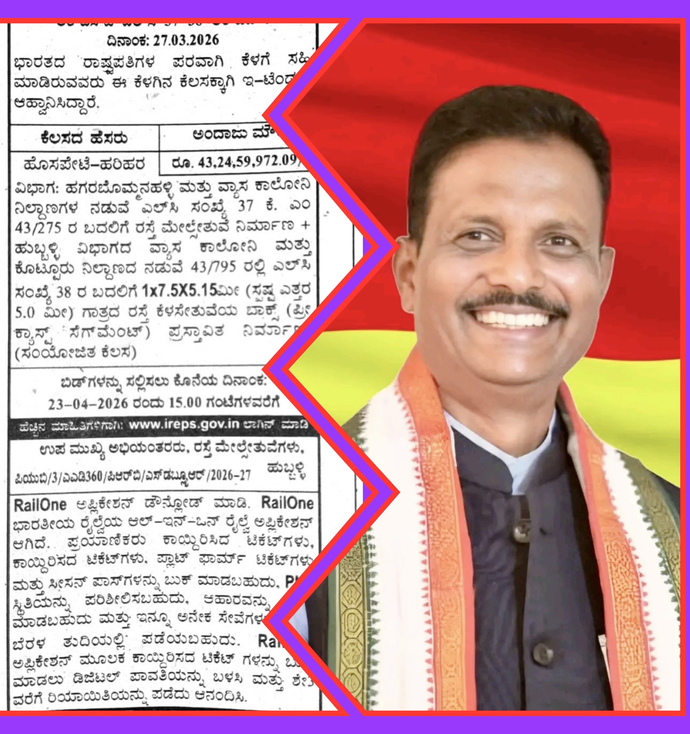 ಹಗರಿಬೊಮ್ಮನಹಳ್ಳಿ ಪಟ್ಟಣದ ರಾಮನಗರ ಬಳಿಯ ರೈಲ್ವೆ ಗೇಟ್ ನಂಬರ್ 37 ರಲ್ಲಿ ಮೇಲ್ಸೇತುವೆ ಹಾಗೂ ಪಟ್ಟಣದ ನೇತಾಜಿ ರಸ್ತೆಯಲ್ಲಿನ ಎಸ್ಬಿಐ ಬ್ಯಾಂಕ್ ಹತ್ತೀರದ ರೈಲ್ವೆ ಗೇಟ್ ನಂಬರ್ 38ರ ಬಳಿ ಕೆಳ ಸೇತುವೆ(ಅಂಡರ್ ಪಾಸ್) ನಿರ್ಮಾಣದ ಕಾಮಗಾರಿಗೆ ಭಾರತೀಯ ರೈಲ್ವೆ ಇಲಾಖೆ ಟೆಂಡರ್ ಕರೆದಿದೆ.